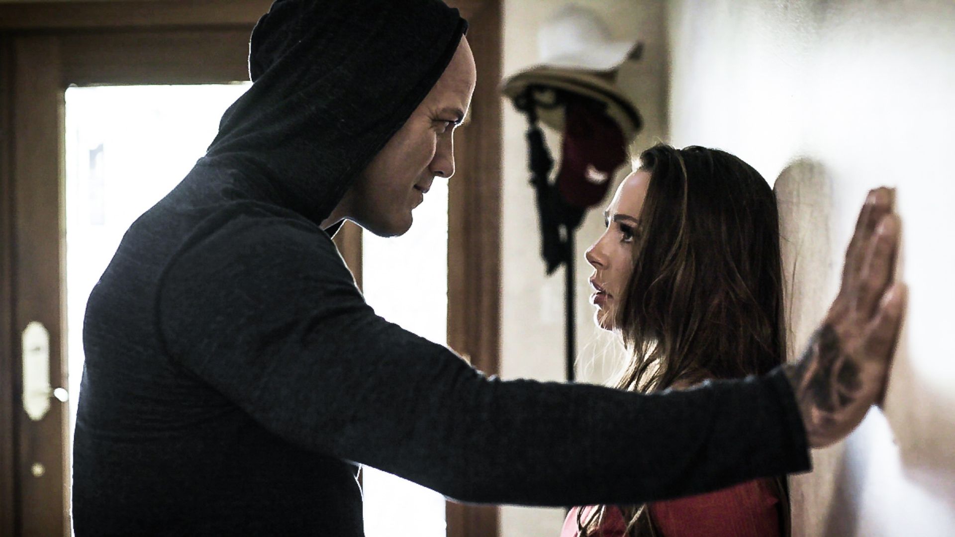 One day, she hears movement within the household. Although she's uncertain, she goes to investigate the sound, glancing nervously to the windows and doors. To her horror, a hooded man (Derrick Pierce) emerges from one of the rooms, confronting her. She's bewildered as the stranger belittles her, telling her how pathetic it is that she's kept herself cooped up for four months -- that's right, he's been WATCHING her. He despises people like her and wants her to prove that her fears are really all just in her head. If she walks out that door, she's a free woman; if she lets her FEARS rule her, then she can submit to him.